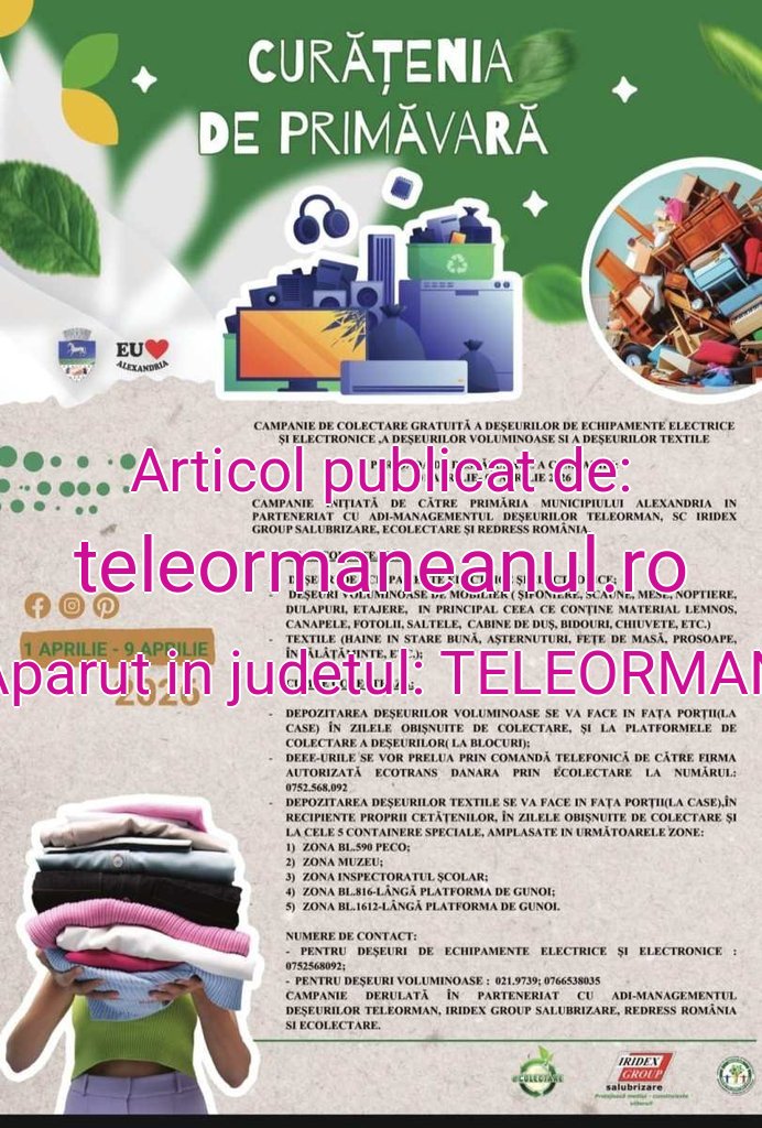 Primăria Alexandria derulează, în perioada 01 – 09 aprilie, campania „Curățenia de primăvară”, o campanie de colectare gratuită a deșeurilor de echipamente electrice și electronice (DEEE), a deșeurilor voluminoase și a deșeurilor textile, au transmis reprezentanții municipalității.
