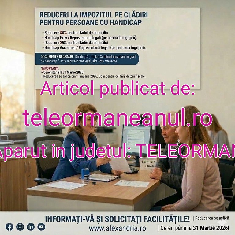 Persoanele cu handicap ce au domiciliul pe raza municipiului Alexandria vor beneficia de reduceri la plata impozitelor pe clădiri, a anunțat primarul Victor Drăgușin. Astfel, potrivit sursei citate, în ceea ce privește clădirile folosite ca domiciliu aflate în proprietatea sau coproprietatea persoanelor cu handicap grav și, respectiv, a reprezentanților legali, beneficiază de reducerea de 50% pe perioada în care au în grijă, supraveghere și întreținere persoane cu handicap grav, în timp ce clădirile folosite ca domiciliu aflate în proprietatea sau coproprietatea persoanelor cu handicap accentuat și, respectiv, a reprezentanților legali, beneficiază de reducerea de 25% pe perioada în care au în grijă, supraveghere și întreținere persoane cu handicap accentuat